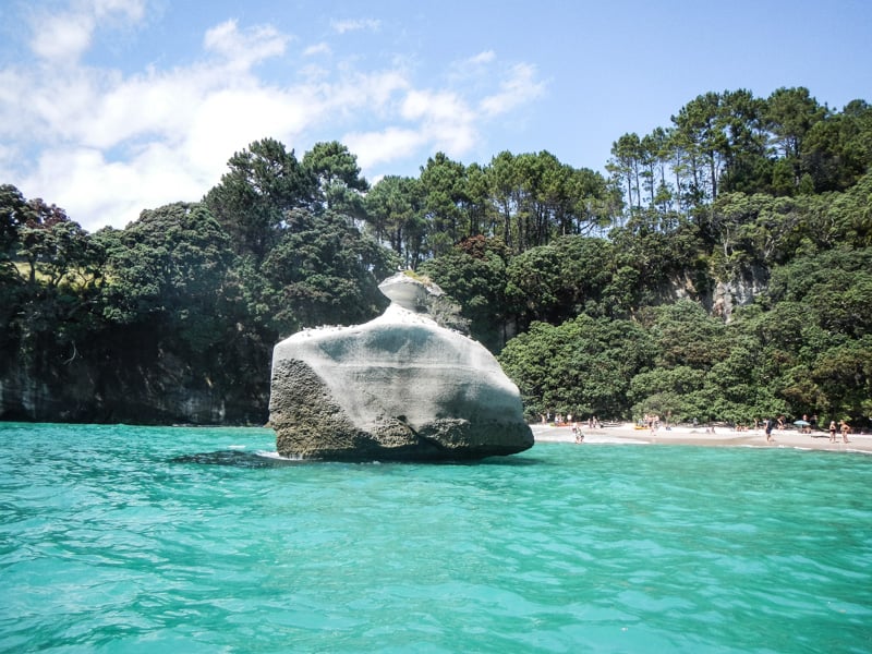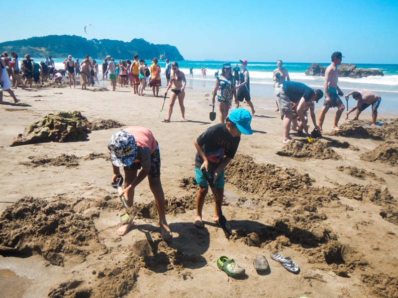 On our last day in Coromandel, we drove to Hahei beach and got on a dinghy, again with life vests on (there seems to be a pattern here!) and bumped our way on choppy waves out on to the open sea. We were mesmerised by the beautiful Cathedral Cove which was the setting for the Chronicles Of Narnia movie. We passed under sea tunnels, bobbed into a sea cave and entered a blowhole. We floated over the Hahei Marine Reserve and fed fish. We later scrambled our way to the Hot Water Beach in Mercury Bay armed with spades and dug ourselves a little sauna of hot water right there on the beach. A truly unique experience on one of New Zealand’s most dangerous beaches, volcanic activity under the surface pushes hot water up through two fissures on the beach an hour on either side of low tide. Hundreds of people flock to this area and dig themselves a little hot water bath that only nature can provide. Amazing!